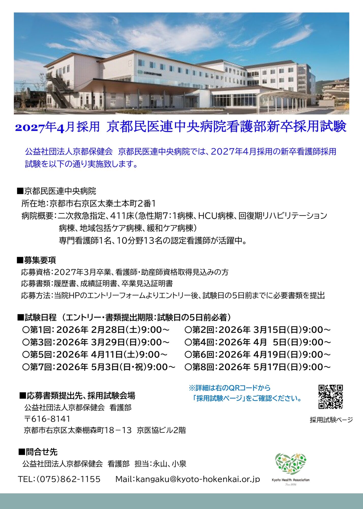 「2027年4月採用 京都民医連中央病院新卒採用試験」案内を掲載しました 2025-12-22 最終更新日時 : 2025-12-22 master 採用試験ページはこちら FacebookXBlueskyHatenaCopy